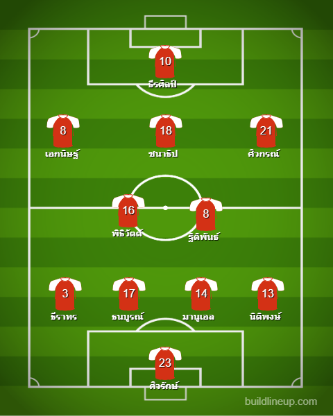 ถ้านิว ฐิติพันธ์ และ เจ ชนาธิป หายจากการอาการบาดเจ็บขึ้นมา ก็จะทำให้ แผนกองกลางจะมีผู้เล่นที่ทำให้นิชิโนะเลือกใช้งานมากขึ้น ส่วนหน้าเป้า น่าจะเลือกใช้งานเพียงแค่สามคนเท่านั้น ไม่ว่าจะเป็น ธีรศิลป์ แดงดา ศุภชัย ใจเด็ด และ ศุภณัฐ เหมือนตา